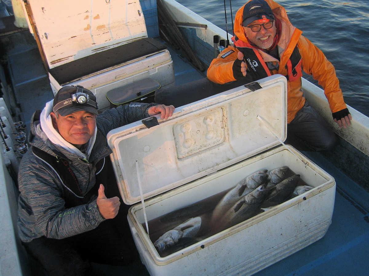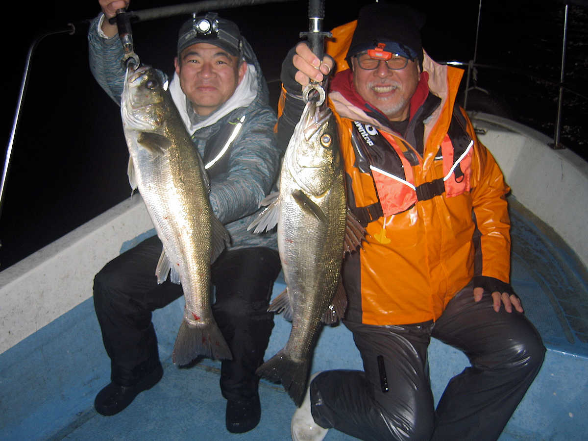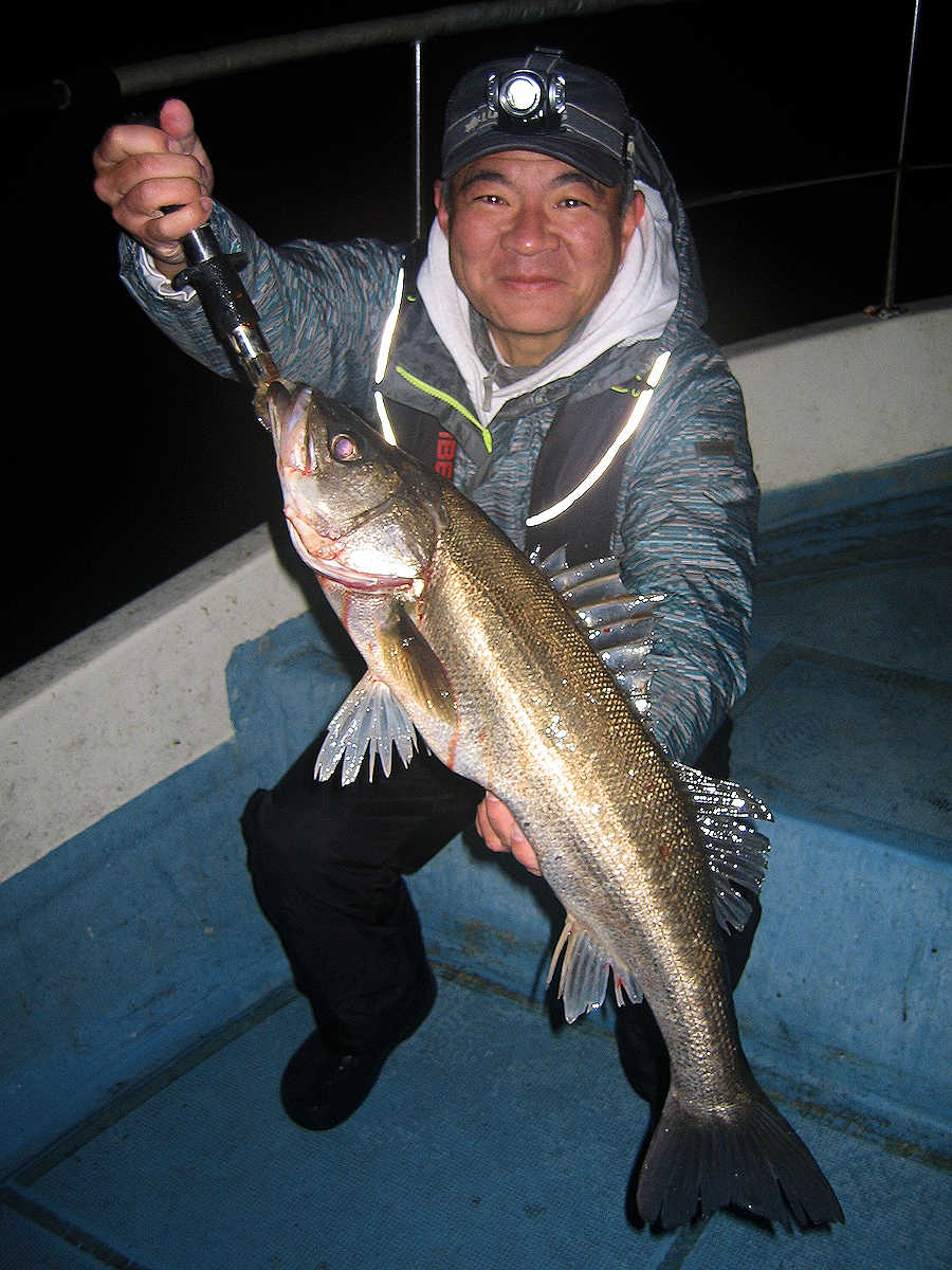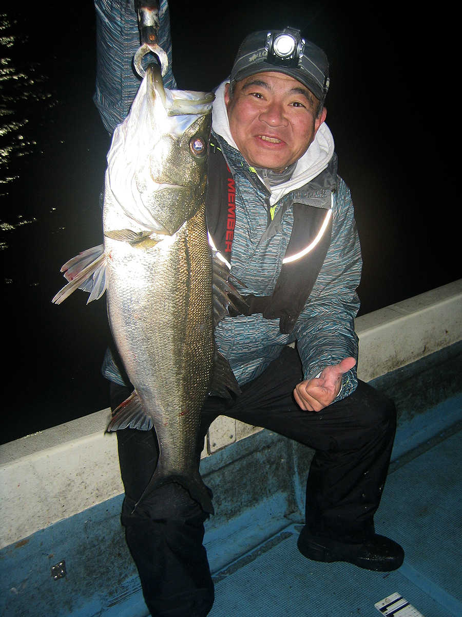 ■シーバス・ナイト×55匹 +放流サイズ×5匹 ■コメント ヤヤ強い風に3度悩まされ、釣果が悪かったお二人。 今回も後半に風が強くなり苦戦しましたが、無事に60匹キャッチでき楽しい釣りとなりました! いや~、今年最後の乗船で、大漁で良かったです。 ■シーバス・ナイト×55匹 +放流サイズ×5匹 □サイズ:45~50cm×5匹(放)/53cm前後×5匹/56cm前後×5匹ぐらい/60cm前後×20匹ぐらい/64cm前後×15匹ぐらい/67cm前後×8匹ぐらい/70cm×1匹/72cm×1匹 |