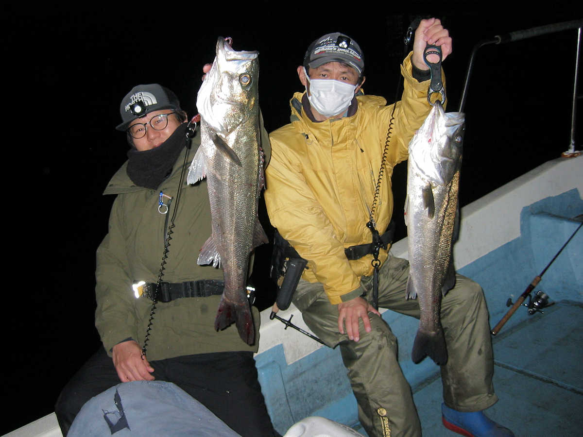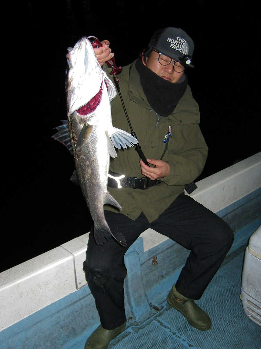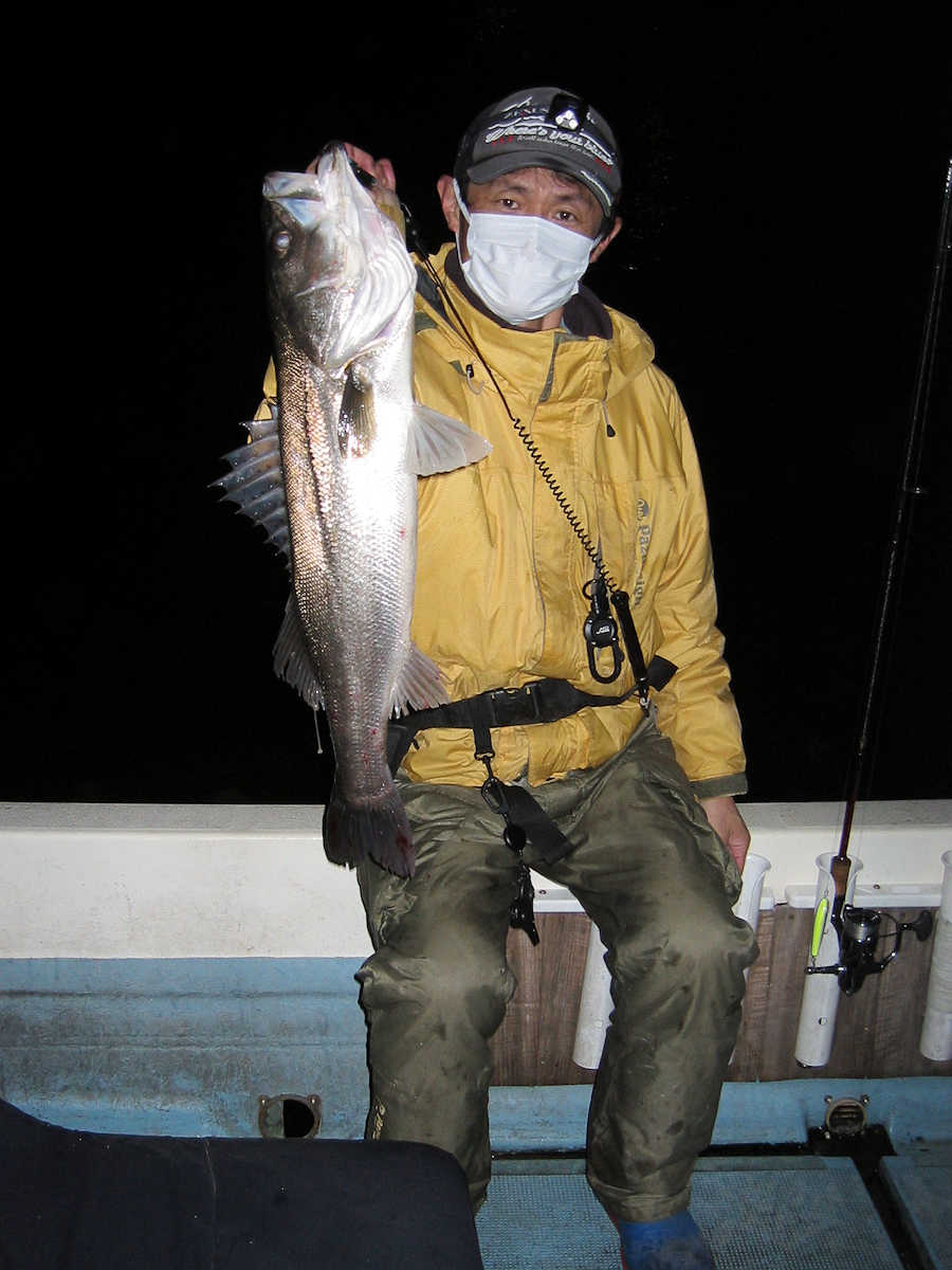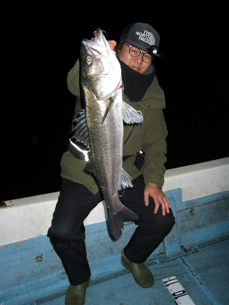 ■シーバス・ナイト×32匹 ■シーバス・デイ×19匹(放流サイズ×13匹含む) ■コメント この日は幸運に恵まれ、サイズが良く大漁でした! 嬉しい事に、ナイトで70アップが4匹、68cm級が3匹、69cm級が2匹でて合計で32匹キャッチできました。 この時期特有のナイトでの大物連発ですが、例年に比べると痩せた魚体が多い事が気がかりでした。 まあ、サイズが良いとお客さまが笑顔のなるので、こんな幸せな仕事は釣り船ならではですね! デイ狙いは前半から中盤までは苦戦の連続で、放流サイズの43cm級がメインで16匹キャッチ! 50cm級が3匹混じりましたが、しばらくは苦戦しそうな雰囲気でした。 後半はノーバイトの連続でしたが、最後の最後で魚の入っているポイントを発見! 65~68cmを3匹キャッチでき、大きそうな魚のバラシもありで、最後の締めくくりも幸運で終了できました。 今年は風が強く出船中止の連続なので、今後の釣果は運と風次第ですね! 海の神さま、風を風速3m以下でお願いします。 ■シーバス・ナイト×32匹 □サイズ:56cm前後×5匹/60cm前後×8匹ぐらい/63cm前後×8匹ぐらい /66cm前後×2匹ぐらい/68cm×3匹/69cm×2匹 /70cm×1匹/71cm×1匹/72cm×1匹/73cm×1匹 ■シーバス・デイ×19匹(放流サイズ×13匹含む) □サイズ:43cm前後×13匹/50cm前後×1匹/56cm前後×2匹 /65cm×1匹/67cm×1匹/68cm×1匹 |