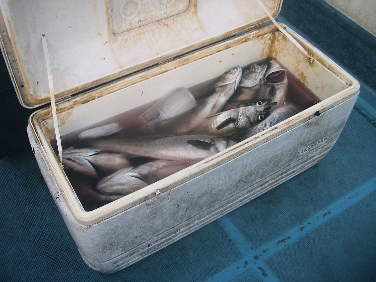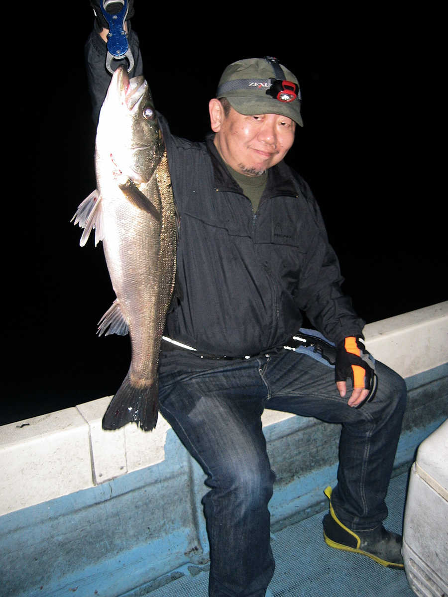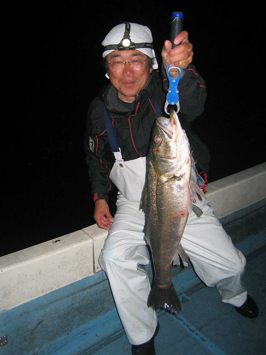 クーラーの中に沢山の魚が入っているように見えますが、実際には海水の量が多いだけです。 ■シーバス・ナイト×21匹 ■コメント 今年は異常気象かと思うほど風が吹き、出船できない日々が多く頭を抱えています。 この日は運良く風が収まり狙いに行けました。 お魚のご機嫌はイマイチで、サイズは50㎝級が混じるようになり、60㎝アップフィーバーは終わったようです。 とは言え、お二人共にバラシが多く、「アッ、バレた!」の連続。 普通のバラシ確率なら、プラス20匹は確実だったと思います。アハハ・・・ まあ、こんな日もありますので、ルアーフィッシングは奥が深いですね! ■シーバス・ナイト×21匹 □サイズ:53cm前後×2匹/56cm前後×3匹/58cm前後×6匹ぐらい/60cm前後×7匹ぐらい/65cm前後×2匹/69cm×1匹 |