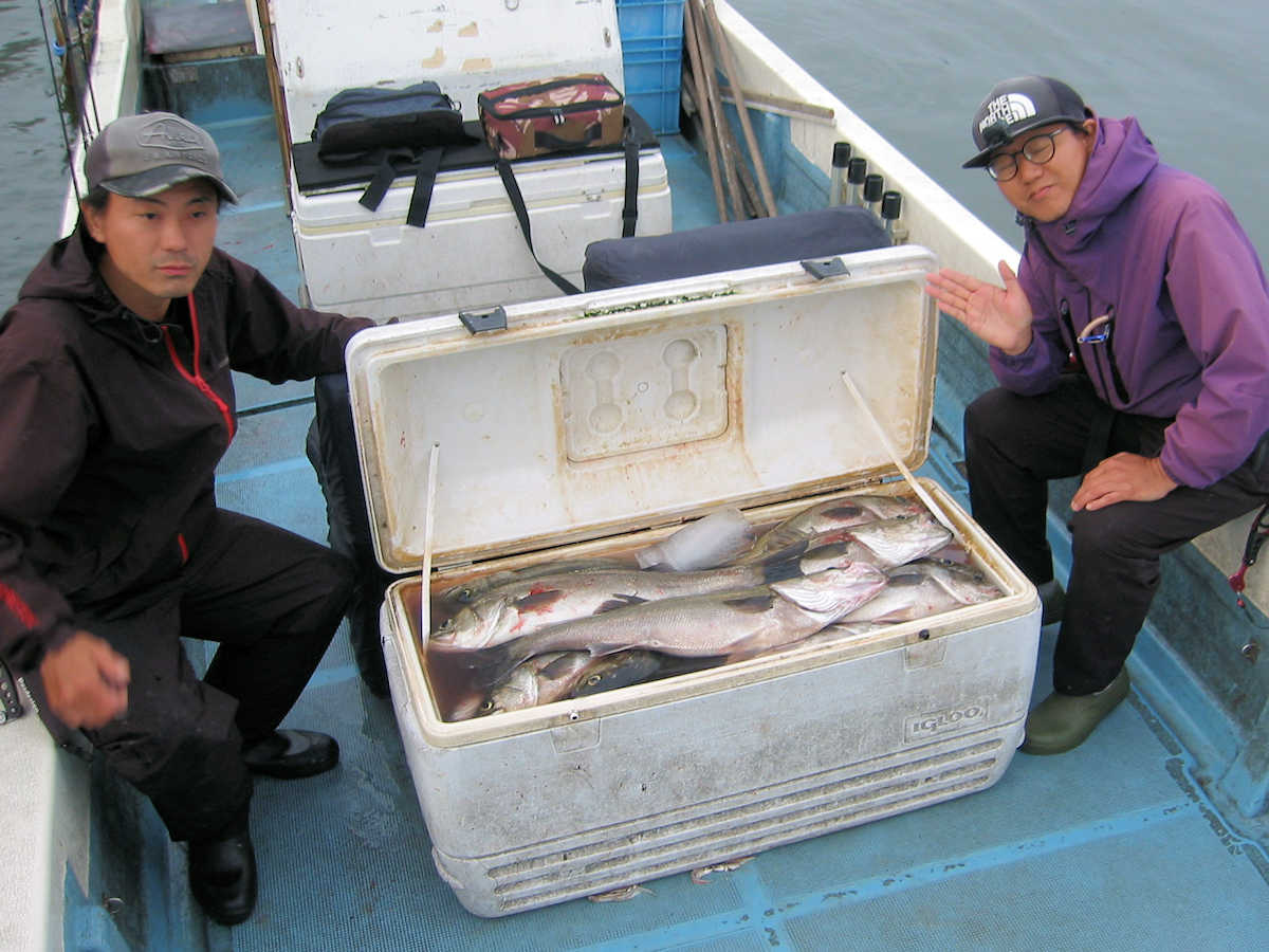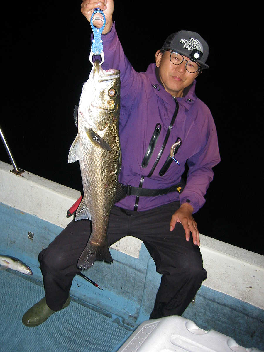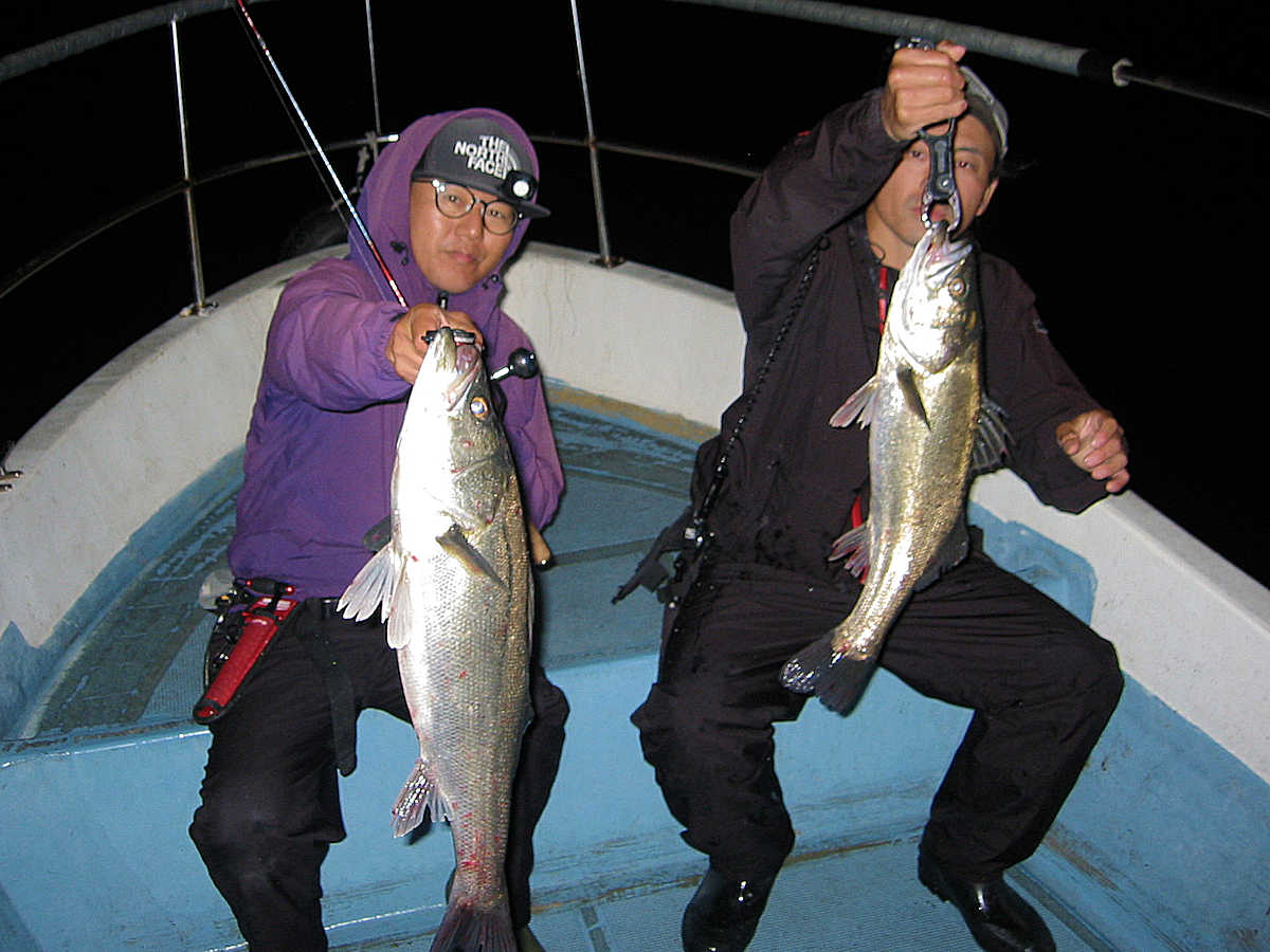 ■シーバス・ナイト×46匹(放流サイズ×4匹含む) ■コメント 好調のナイト狙い、狙うポイントによっては40~50㎝級が混じりましたが、60㎝アップも22匹ぐらいキャッチでき、クーラー満タンの大漁でした! 今後も、引き続き釣れて続いて欲しいですね! ちなみに、今年は赤クラゲが多そうな予感。 いやだね~。 ■シーバス・ナイト×50匹(放流サイズ×4匹含む) □サイズ:40cm前後×4匹/45cm前後×5匹ぐらい/50cm前後×7匹ぐらい/53cm前後×7匹ぐらい/56cm前後×5匹ぐらい /60cm前後×9匹ぐらい/63cm前後×7匹ぐらい/66cm前後×4匹/68cm×1匹/69cm×1匹 |