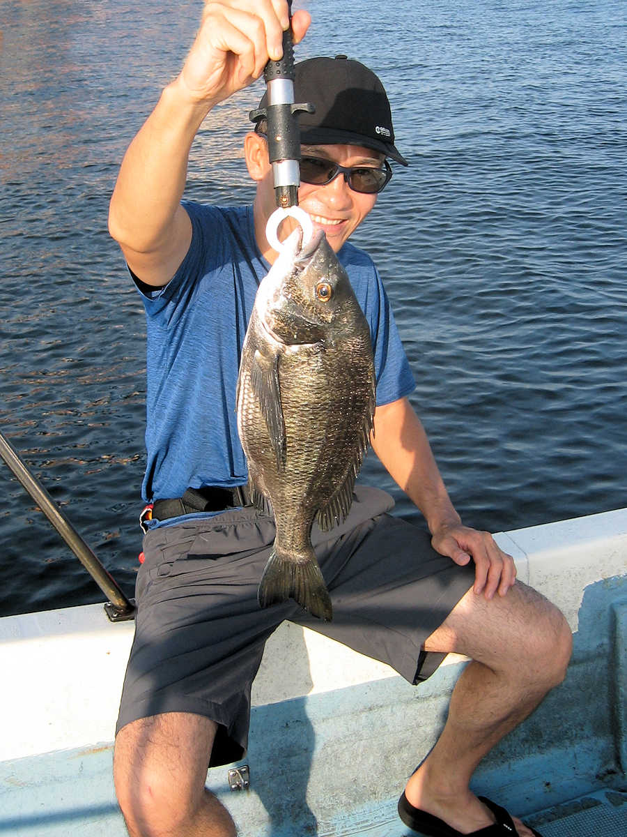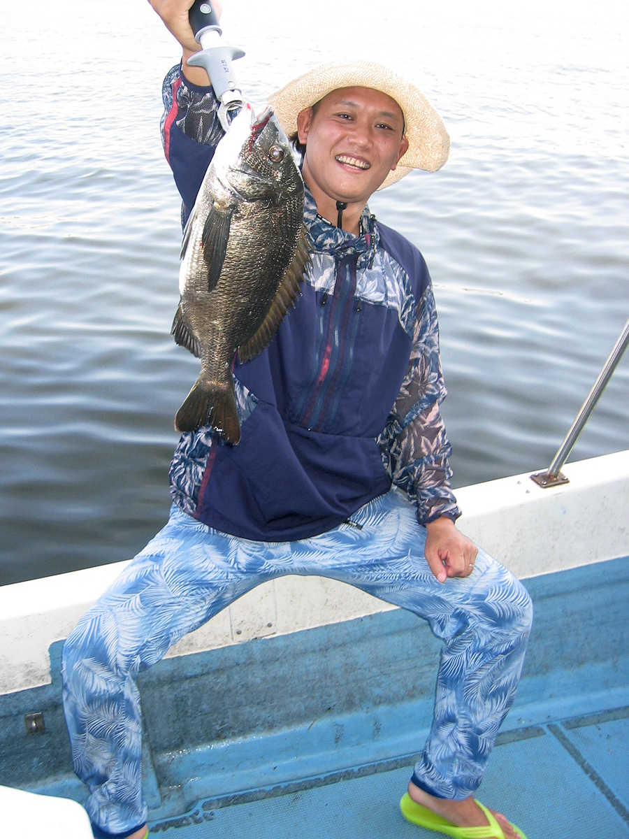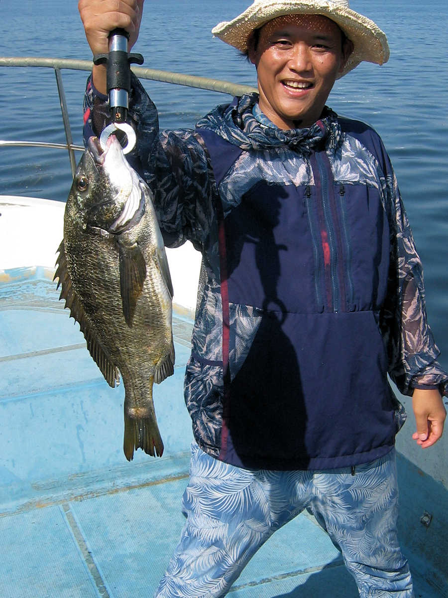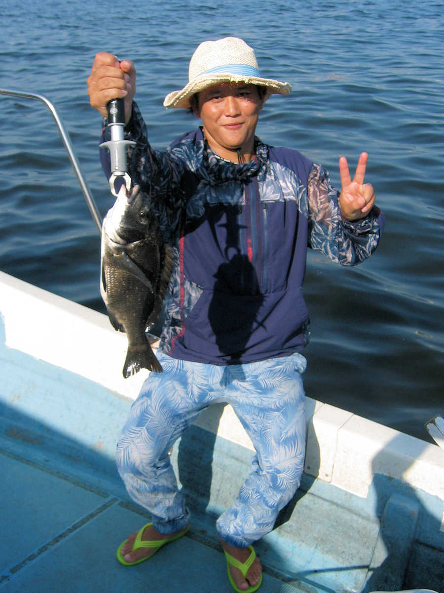 ■タコのはっちゃん×タコボーズ!\(-o-)/ ■黒鯛×25匹(キビレ×2匹含む) ■コメント この日はタコ&黒鯛狙いで出船。 まずはタコ狙い、3日前に狙った際は5ハイGETできましたがアタリが少なく苦戦しましたので、「お勧めしない」とお話ししましたが、「2,3バイ釣れれば良い」との事でしたので狙いに行きました。 で、「2,3バイなら、なんとかなるだろう」と思っていましたが、結果は、なんとタコボーズ! ヒットは2ハイ(推定:中~小サイズ)で、巻き巻きしている最中に外れてしまいました。 で、いつかはお客さまに話さなければならないと感じていた、『禁句であるタコボーズ!』、こんなにも早く話すことになるとはね~。トホホ・・・ のんびりタコを狙っていると太陽ギラギラで死にそうな気温になるので、早々諦め黒鯛狙いに変更。 海水のニゴリ具合は前日と同じで、薄めの茶色いニゴリ具合。 前日アタリが多かったポイントから釣りを開始するが、「あれれ? アタリの数が異常なくらい少ない?」、もしや『前日イジメたせいかな~?』と感じながらアチコチ狙い、結果、80発ぐらいアタリがあり25匹キャッチできました。 とは言え、前日同様に、バラシ・スッポヌケ・エサ潰されに泣かされ、釣果は伸びませんでした。 この日、黒鯛狙い初挑戦の『青物ジグ師・ピカピカ君』。 初挑戦とは思えないくらい仕掛けの投入が上手く一安心。 「あれや・これや」と狙い目や釣り方のコツを説明しながらの釣りとなりましたが、中盤以降はコツがわかったようでアタリの数が増えていきました。 ちなみに、ベテランのシンちゃんは息子とピカピカ君に釣らせるため、終始『接待釣法』での釣りでしたが、スッポヌケやエサ潰されで相棒が戦線離脱した際に竿を出し、&たまにズル込み釣法でキャッチしていました。アハハ ■黒鯛× 25匹 □アタリの数:80発ぐらい □ピカピカ君× 9匹 □れいちゃん× 8匹 □しんちゃん× 8匹 |