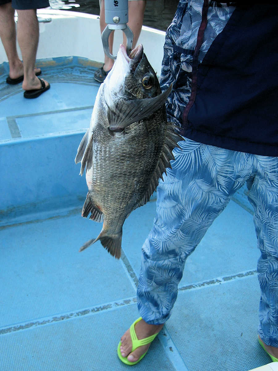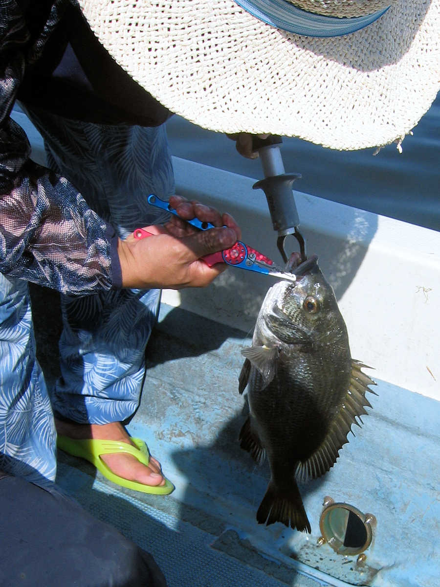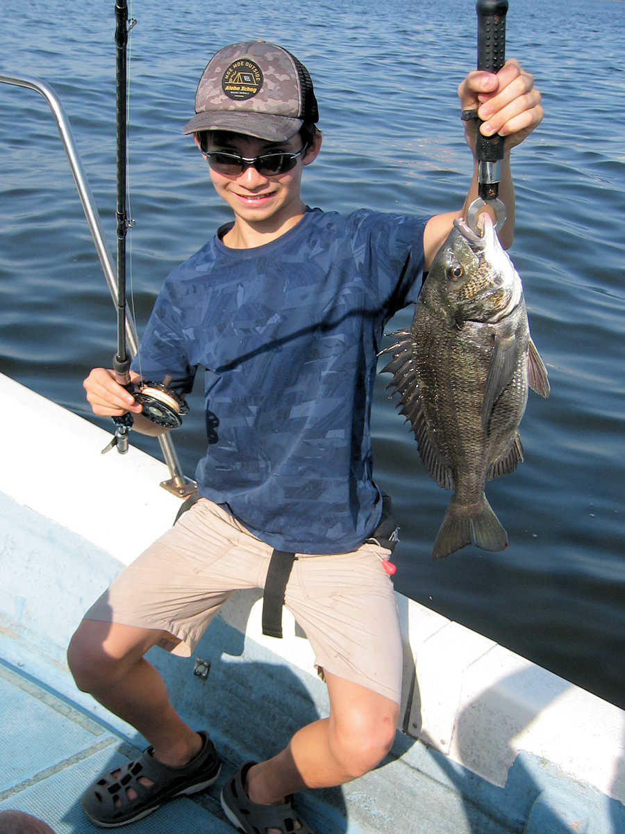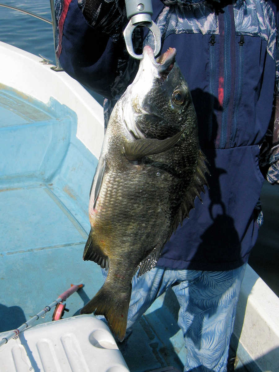 ■タコのはっちゃん×タコボーズ!\(-o-)/ ■黒鯛×25匹(キビレ×2匹含む) ■コメント この日はタコ&黒鯛狙いで出船。 まずはタコ狙い、3日前に狙った際は5ハイGETできましたがアタリが少なく苦戦しましたので、「お勧めしない」とお話ししましたが、「2,3バイ釣れれば良い」との事でしたので狙いに行きました。 で、「2,3バイなら、なんとかなるだろう」と思っていましたが、結果は、なんとタコボーズ! ヒットは2ハイ(推定:中~小サイズ)で、巻き巻きしている最中に外れてしまいました。 で、いつかはお客さまに話さなければならないと感じていた、『禁句であるタコボーズ!』、こんなにも早く話すことになるとはね~。トホホ・・・ のんびりタコを狙っていると太陽ギラギラで死にそうな気温になるので、早々諦め黒鯛狙いに変更。 海水のニゴリ具合は前日と同じで、薄めの茶色いニゴリ具合。 前日アタリが多かったポイントから釣りを開始するが、「あれれ? アタリの数が異常なくらい少ない?」、もしや『前日イジメたせいかな~?』と感じながらアチコチ狙い、結果、80発ぐらいアタリがあり25匹キャッチできました。 とは言え、前日同様に、バラシ・スッポヌケ・エサ潰されに泣かされ、釣果は伸びませんでした。 この日、黒鯛狙い初挑戦の『青物ジグ師・ピカピカ君』。 初挑戦とは思えないくらい仕掛けの投入が上手く一安心。 「あれや・これや」と狙い目や釣り方のコツを説明しながらの釣りとなりましたが、中盤以降はコツがわかったようでアタリの数が増えていきました。 ちなみに、ベテランのシンちゃんは息子とピカピカ君に釣らせるため、終始『接待釣法』での釣りでしたが、スッポヌケやエサ潰されで相棒が戦線離脱した際に竿を出し、&たまにズル込み釣法でキャッチしていました。アハハ ■黒鯛× 25匹 □アタリの数:80発ぐらい □ピカピカ君× 9匹 □れいちゃん× 8匹 □しんちゃん× 8匹 |