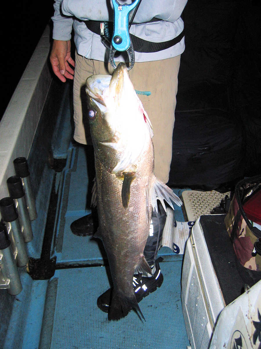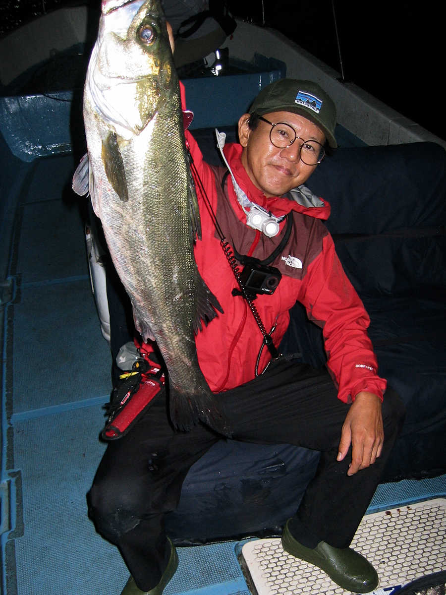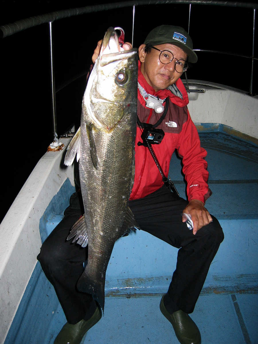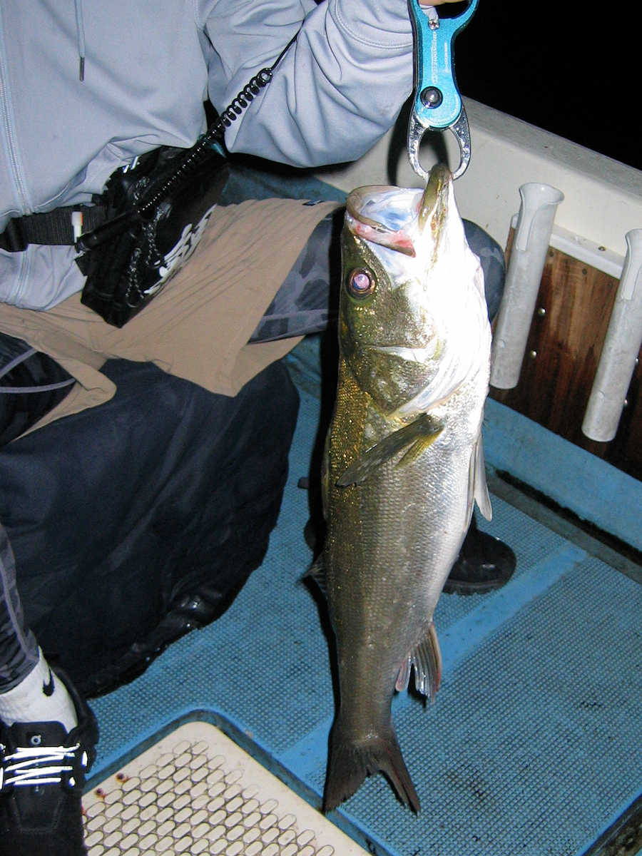 ■シーバス・ナイト×16匹 +放流サイズ×1匹 ■コメント この日はお二人共に『バラシの王様状態』でキャッチ数が伸びませんでしたが、70㎝アップを2匹含め16匹キャッチでき良かったです。 実際、前日は大物フィーバーでしたのでウキウキしながら狙いましたが、結果はシ~~ン状態の連続! 「あれれ? マジか!」どうやら魚が移動してしまったようです。残念! で、移動を繰り返し、1匹目(57㎝級)・2匹目(57㎝級)をキャッチしましたが、その魚がセイゴ級のサイズに見えてしまう私。ムムム・・・オカシイ??? 原因は、前日65㎝以上の太った魚ばかり見ていたので、タモ入れした瞬間の重量感と長さの関係で小さく見えてしまいました。 「それだけ前日は凄かったんだな~」と痛感した船頭でした。アハハ・・・ そんなこんなで前日のようなペースで魚は釣れず、ヤヤ苦戦しながらの釣りが続きました。 実際には魚はポツポツとヒットしていましたが、普段バラシが少ないお二人が、この日はバラシが多くオートリリースの連続! マクーさんはダメダメモード全開で、 スプリットリングが伸びてのサヨナラや、 ダブルヒットし、二人のラインが交差してマクーさんがラインブレイクや、 ヤリトリの最中にPEラインの中央部分から切れるラインブレイクなど、 滅多に発生しないトラブルも追加され、終始頭を抱えていました。 まあ、私が遊漁船を始める前、一人で釣り(漁)をしていた頃にも『バラシが多い日と少ない日』とがありましたので、当日の魚の活性具合でルアーへのバイト状態が変わると思っています。 なので、次回敵討ちしましょう! って話をすると、「逆に返り討ちに合うかも?」と良く返答されます。アハハ・・・ ちなみに、最後の写真、魚がクーラーの半分以上入っており数釣りができたように感じますが、実際には水氷の量が多かっただけで16匹しか入っておりません。 漁港で魚を卸す際、「あれ、こんなに少なかったっけ?」と驚いた私。 25~30匹キャッチした印象でしたが、実際にはタモを手に持ったが、バラシばかりでキャッチできなかったって事でした。アハハ・・・ ■シーバス・ナイト×16匹 +放流サイズ×1匹 □サイズ:57cm前後×5匹ぐらい/62cm前後×4匹ぐらい/64cm前後×3匹ぐらい/67cm前後×2匹/71cm×1匹/74cm×1匹 |