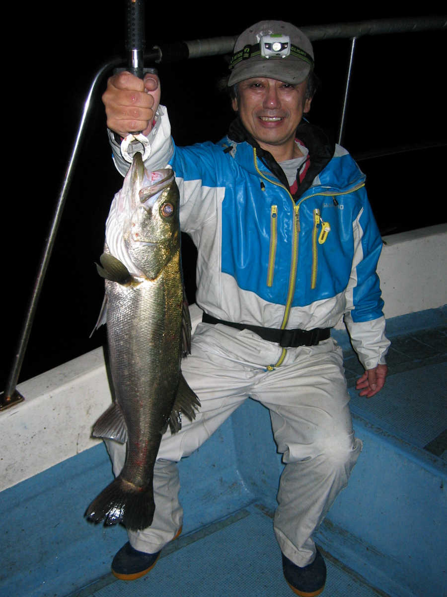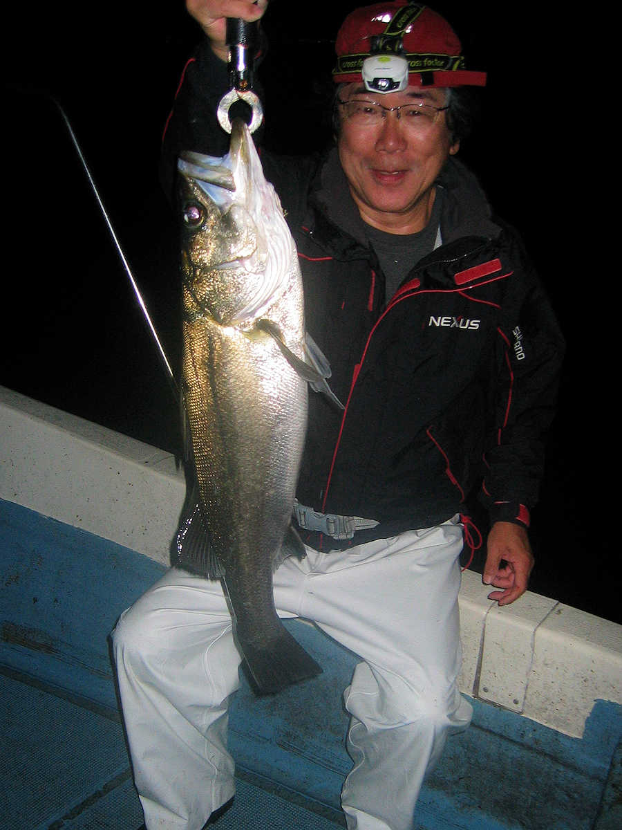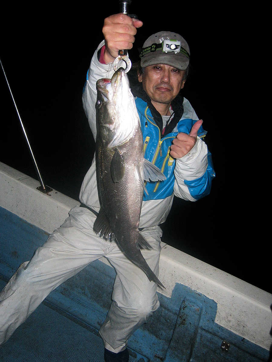 ■シーバス・ナイト×36匹 ■サワラ×ボーズ! □タチウオ×1匹(中サイズ) ■この日の題名:わたちゃん、敵討ち成功! この日は63~71㎝のサイズを25匹キャッチでき、大物フィーバーでした。 前半は65㎝以上のサイズがメインでニコニコ状態。 写真撮影をする暇なく、と言うか、「船長、写真なんて撮影しなくて良いので早く釣りしましょう!」と催促され狙い続けました! アハハ 中盤以降はサイズが小さくなり、57~62㎝級がメイン。 薄明るくなりバイトが止まり、楽しい釣りに満足して終了となりました。 二日前にバラシと乗りそこないのコンに泣いたワタちゃんでしたが、この日はバラシ少なくお見事でした! 敵討ちが出来て良かったですね! その後、第二本命のサワラ狙いのポイントへ移動。 前日サワラとサゴシのハネが出ていたポイントに直行しましたが、この日はヤヤ強の風で波立っている状態。 で、ハネやジャンプは見られず、鳥ちゃんも飛んでいない。 で、アタリなく、少し遠くまで怪しいポイントを探しに行ったが気配無く、最終的に他船が集まっている、風がヤヤ避けられるポイントで狙うがタチウオを1匹キャッチしただけで終了となりました。 トホホ・・・ ■シーバス・ナイト×36匹 □サイズ:55cm前後×1匹/58cm前後×5匹/61cm前後×5匹ぐらい /64cm前後×10匹ぐらい/67cm前後×8匹ぐらい/70cm前後×7匹 ■サワラ×ボーズ! □タチウオ×1匹(中サイズ) |
