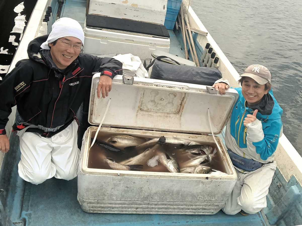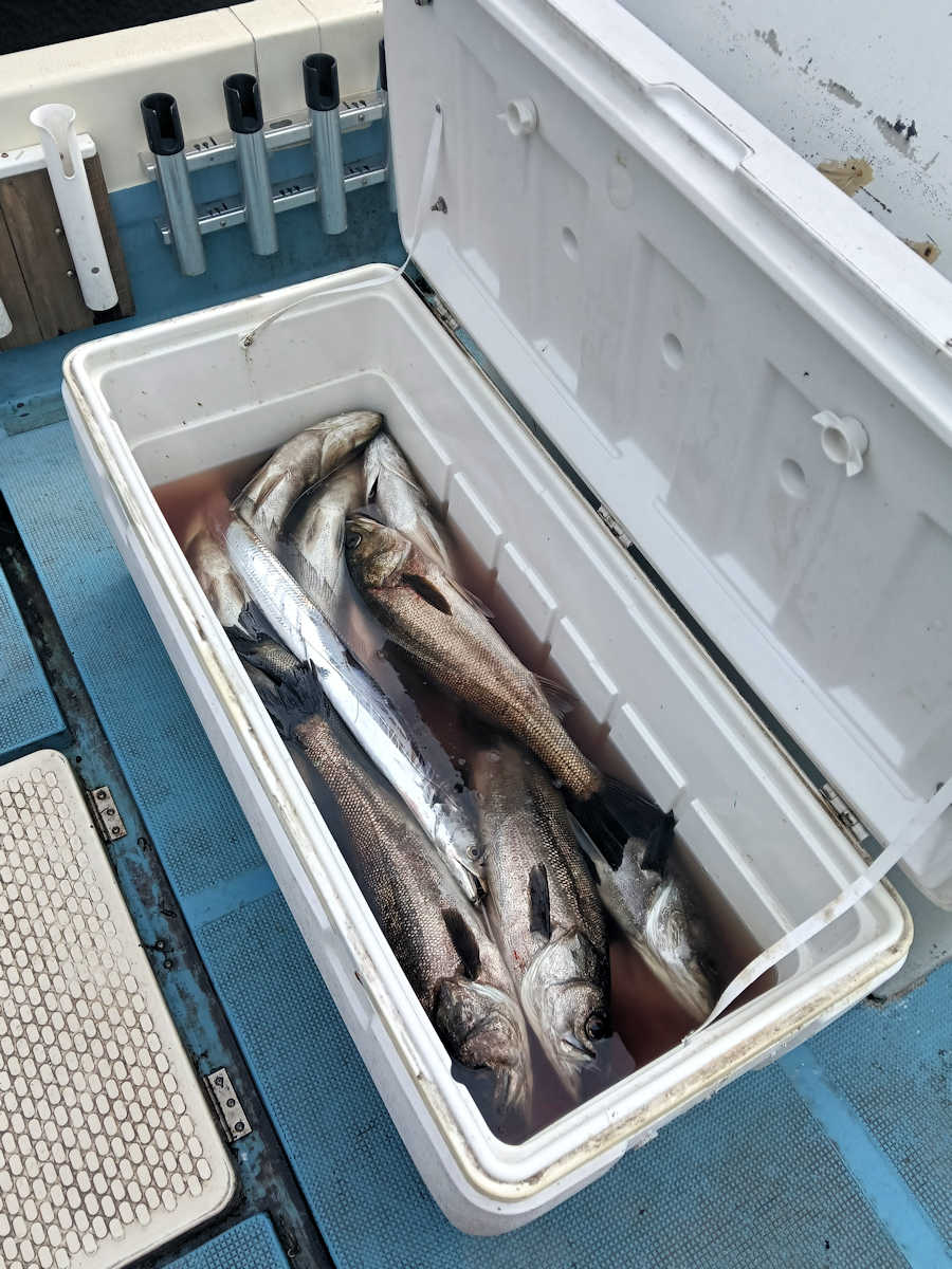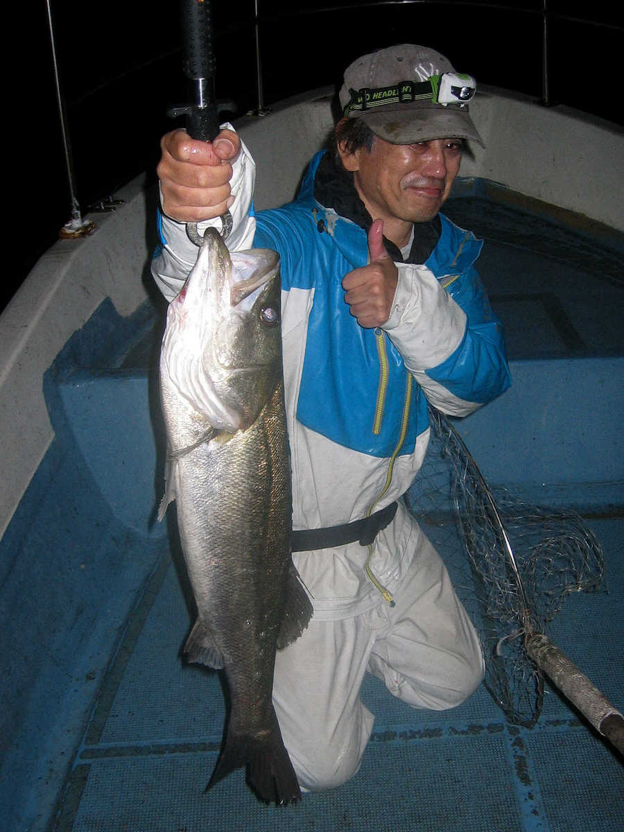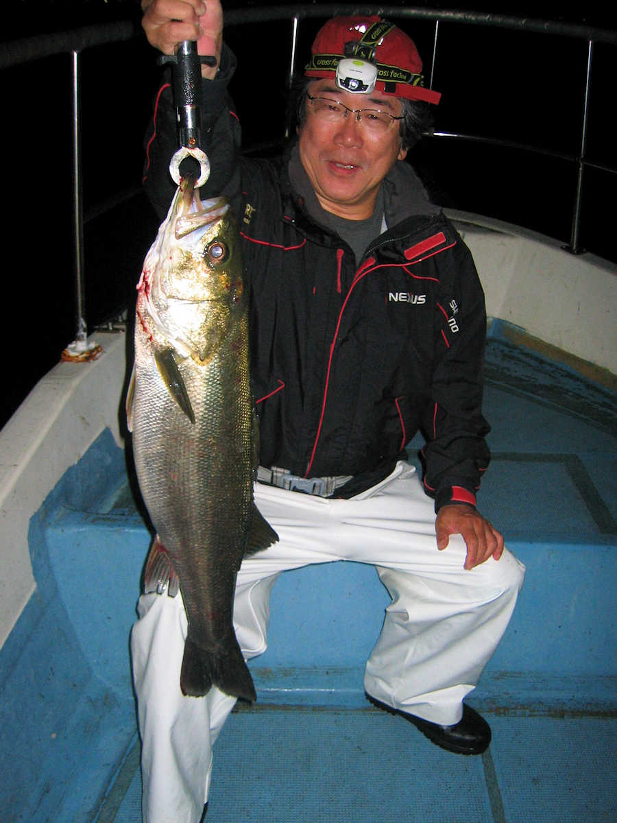 ■シーバス・ナイト×36匹 ■サワラ×ボーズ! □タチウオ×1匹(中サイズ) ■この日の題名:わたちゃん、敵討ち成功! この日は63~71㎝のサイズを25匹キャッチでき、大物フィーバーでした。 前半は65㎝以上のサイズがメインでニコニコ状態。 写真撮影をする暇なく、と言うか、「船長、写真なんて撮影しなくて良いので早く釣りしましょう!」と催促され狙い続けました! アハハ 中盤以降はサイズが小さくなり、57~62㎝級がメイン。 薄明るくなりバイトが止まり、楽しい釣りに満足して終了となりました。 二日前にバラシと乗りそこないのコンに泣いたワタちゃんでしたが、この日はバラシ少なくお見事でした! 敵討ちが出来て良かったですね! その後、第二本命のサワラ狙いのポイントへ移動。 前日サワラとサゴシのハネが出ていたポイントに直行しましたが、この日はヤヤ強の風で波立っている状態。 で、ハネやジャンプは見られず、鳥ちゃんも飛んでいない。 で、アタリなく、少し遠くまで怪しいポイントを探しに行ったが気配無く、最終的に他船が集まっている、風がヤヤ避けられるポイントで狙うがタチウオを1匹キャッチしただけで終了となりました。 トホホ・・・ ■シーバス・ナイト×36匹 □サイズ:55cm前後×1匹/58cm前後×5匹/61cm前後×5匹ぐらい /64cm前後×10匹ぐらい/67cm前後×8匹ぐらい/70cm前後×7匹 ■サワラ×ボーズ! □タチウオ×1匹(中サイズ) |