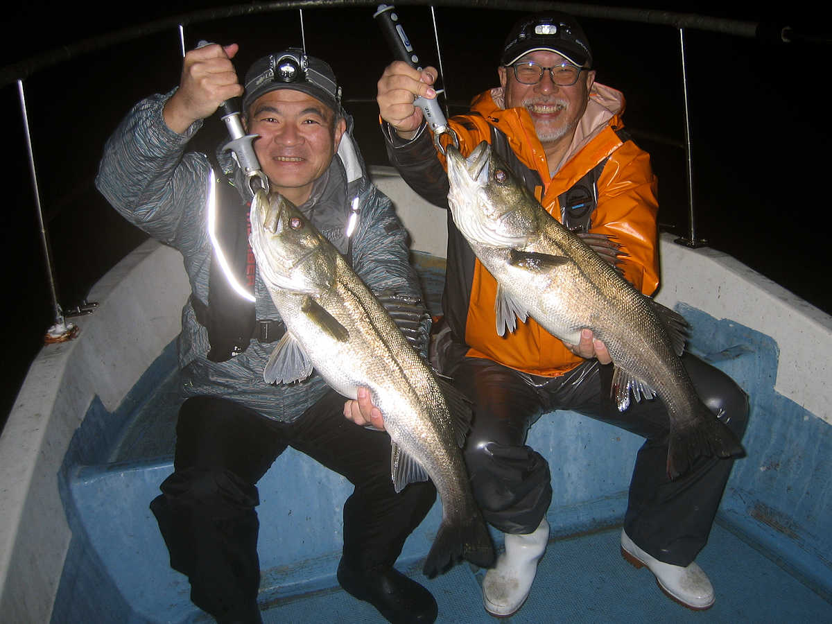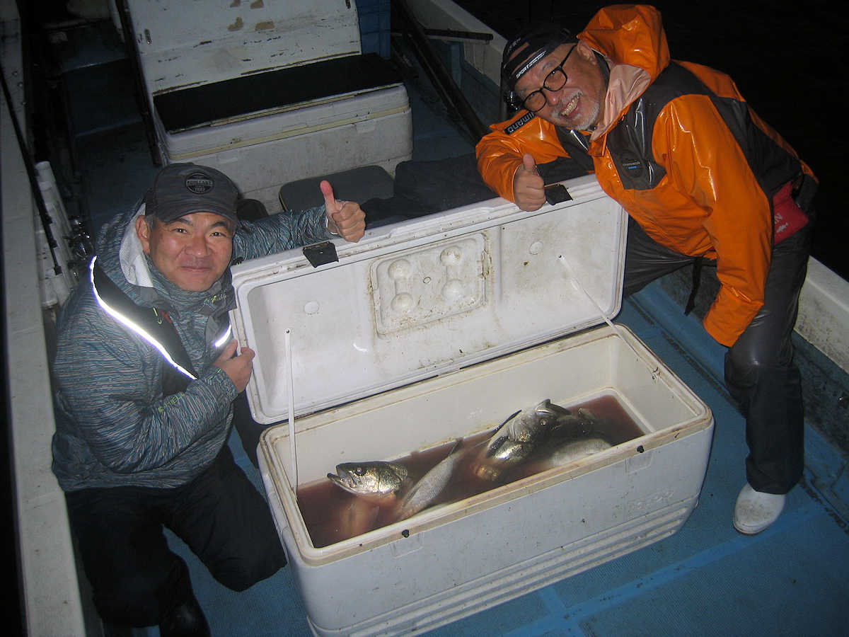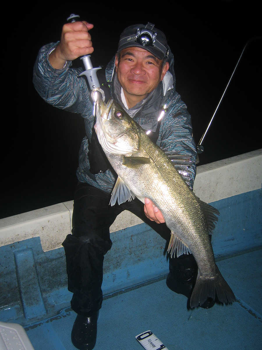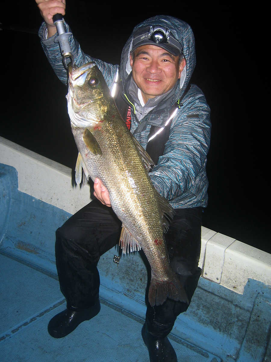 ■シーバス・ナイト×34匹 ■コメント この日、数は釣れませんでしたが、69アップが8匹キャッチでき楽しい釣りとなりました。 何故かしらヤヤ強い風に悩まされる、風羽さんと皮算用さん。 前回の2回はヤヤ強の風で出船し釣果悪く、今回はナギの予報でしたので大漁を期待しましたが、中盤以降徐々に風が強くなり苦戦! 最終的には早上がりとなってしまいました。トホホ・・・ ■シーバス・ナイト×34匹 □サイズ:53cm前後×1匹/57cm前後×4匹/60cm前後×匹ぐらい/64cm前後×匹ぐらい/67cm前後×7匹ぐらい/69cm×2匹/70cm×3匹/74cm×1匹/75cm×1匹/76cm×1匹 |