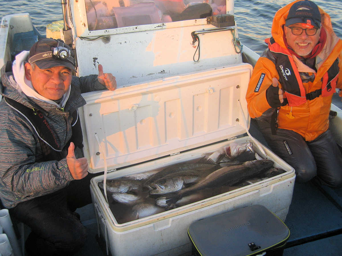 ■シーバス・ナイト×55匹 +放流サイズ×5匹 ■コメント ヤヤ強い風に3度悩まされ、釣果が悪かったお二人。 今回も後半に風が強くなり苦戦しましたが、無事に60匹キャッチでき楽しい釣りとなりました! いや~、今年最後の乗船で、大漁で良かったです。 ■シーバス・ナイト×55匹 +放流サイズ×5匹 □サイズ:45~50cm×5匹(放)/53cm前後×5匹/56cm前後×5匹ぐらい/60cm前後×20匹ぐらい/64cm前後×15匹ぐらい/67cm前後×8匹ぐらい/70cm×1匹/72cm×1匹 |