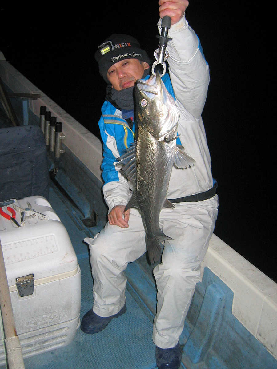 ■シーバス・ナイト×6匹 +放流サイズ×1匹 ■チョロリ・シーバス・デイ×放流サイズ×1匹 ■コメント あちゃ~! ひえ~~! 寂しい釣果で終わってしまいました。 なんと、この日の最大級・68cmは私のルアーにヒット! 喜ぶべきか、お客様に釣らせることが出来ず悲しむべきか、悩む釣行でした。 まあ、自然相手の釣り、こんな日があっても不思議でないですね! トホホホホ・・・ ■シーバス・ナイト×6匹 +放流サイズ×1匹 □サイズ:50cm前後×1匹/58cm前後×2匹/62cm前後×2匹/68cm×1匹/放流サイズ:45cm前後 ■シーバス・デイ×放流サイズ×1匹(40cm前後) |