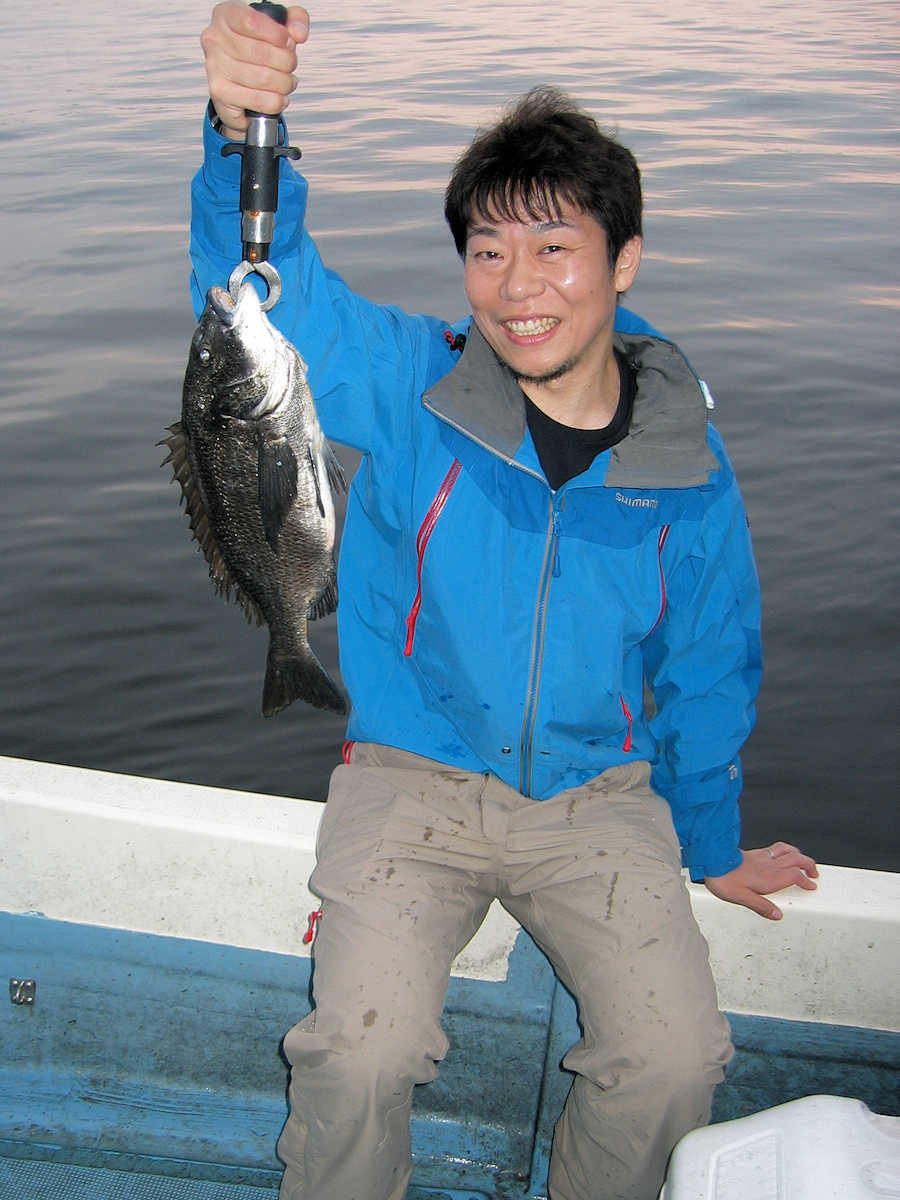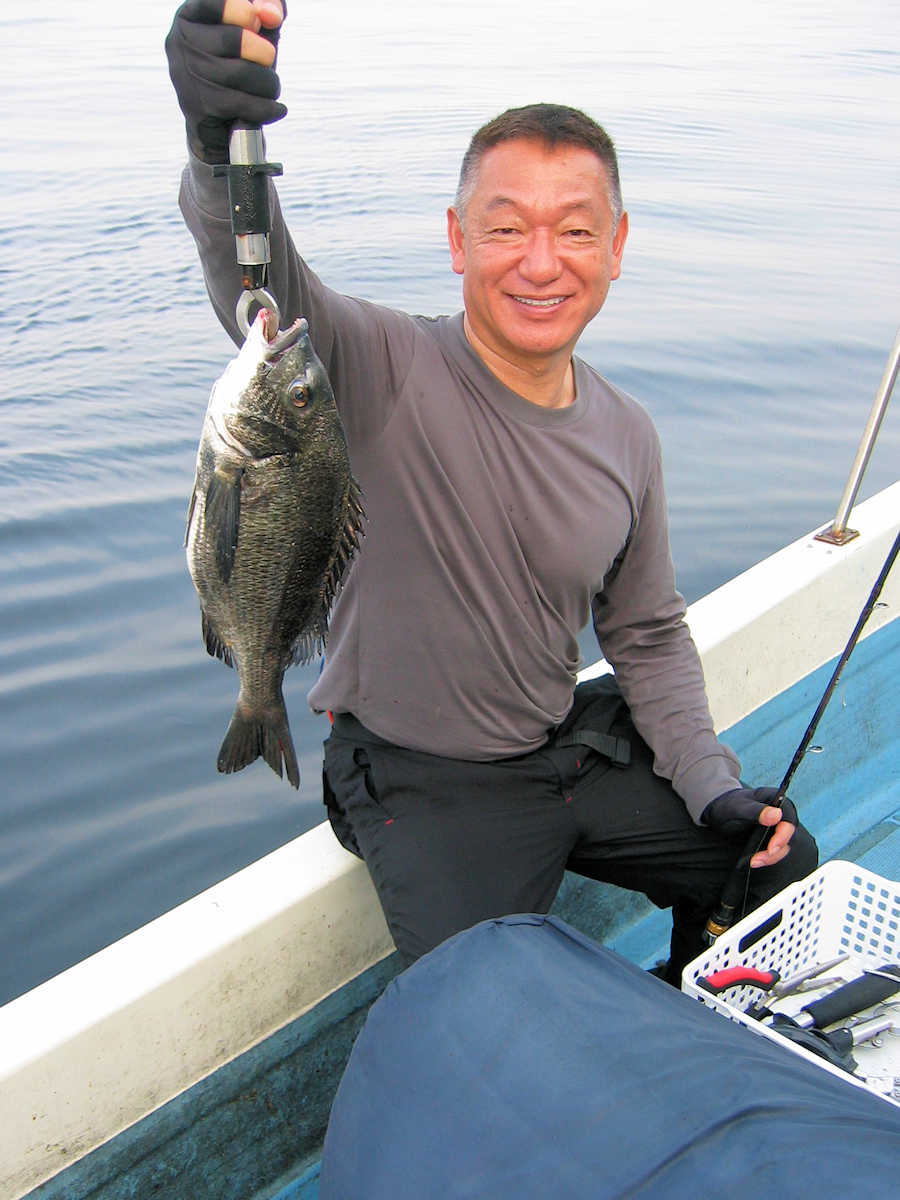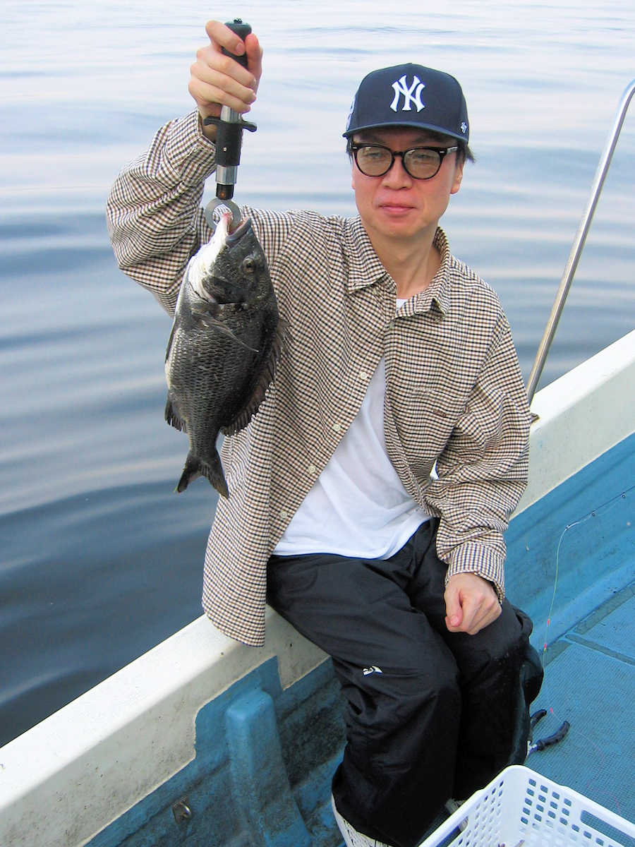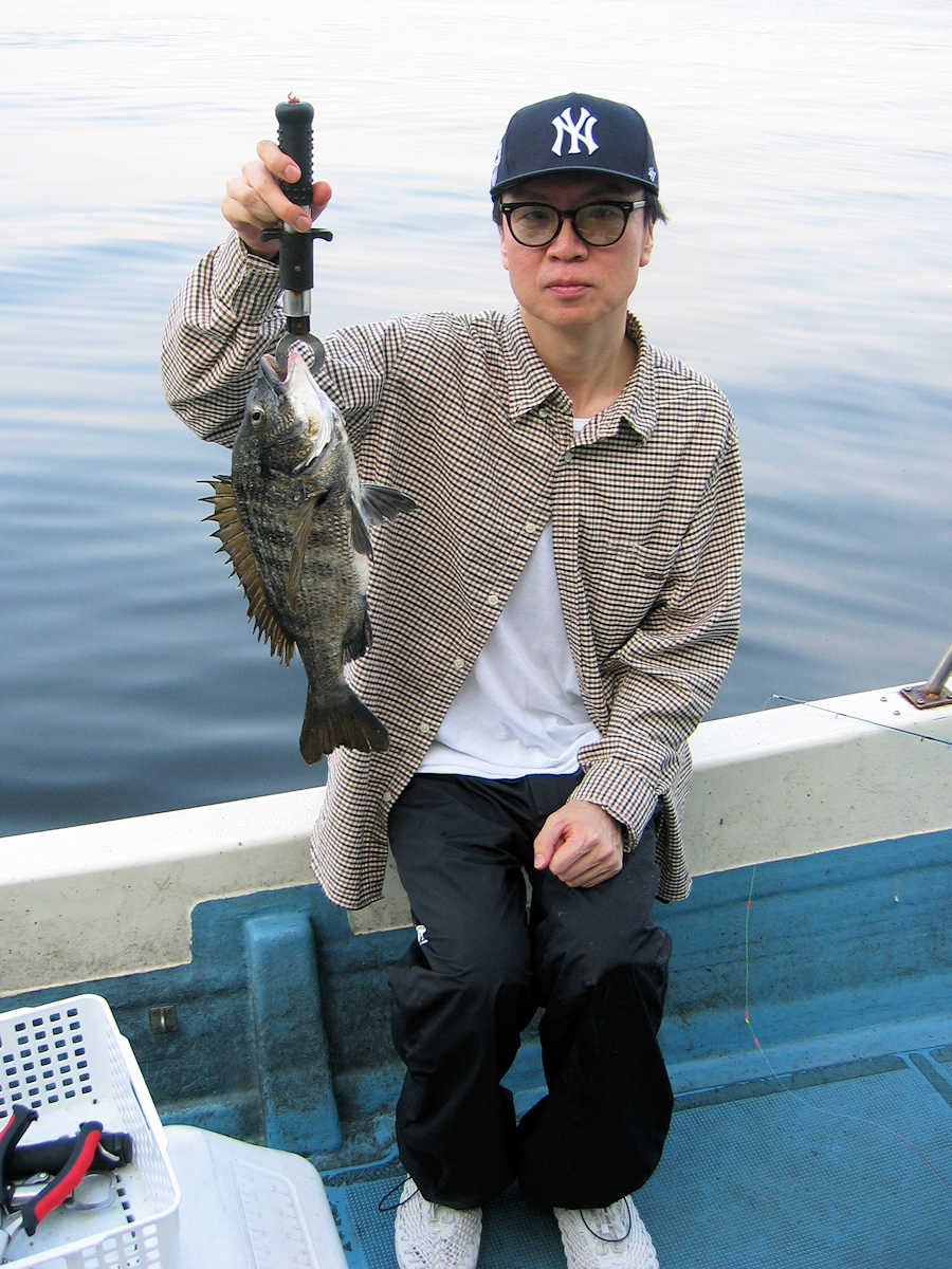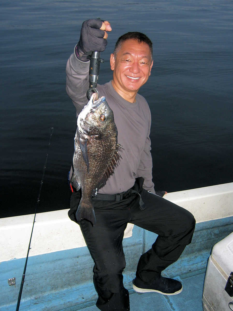 この日は当船の釣りに慣れたタイシさんが、初挑戦のお二人に先頭での竿出しを譲る『接待釣法』のお陰で、タニちゃんが11匹、さえちゃんが10匹の黒鯛をキャッチできました。