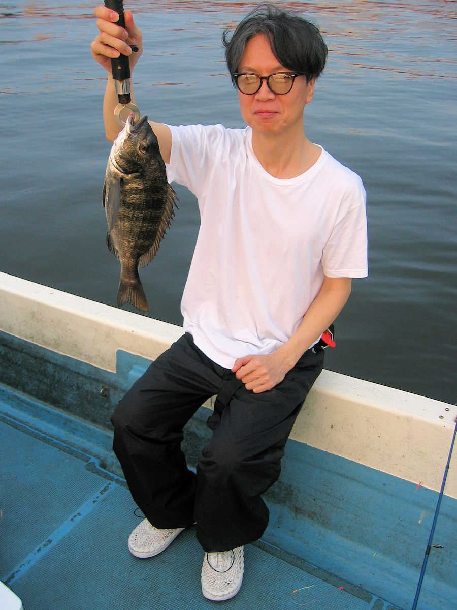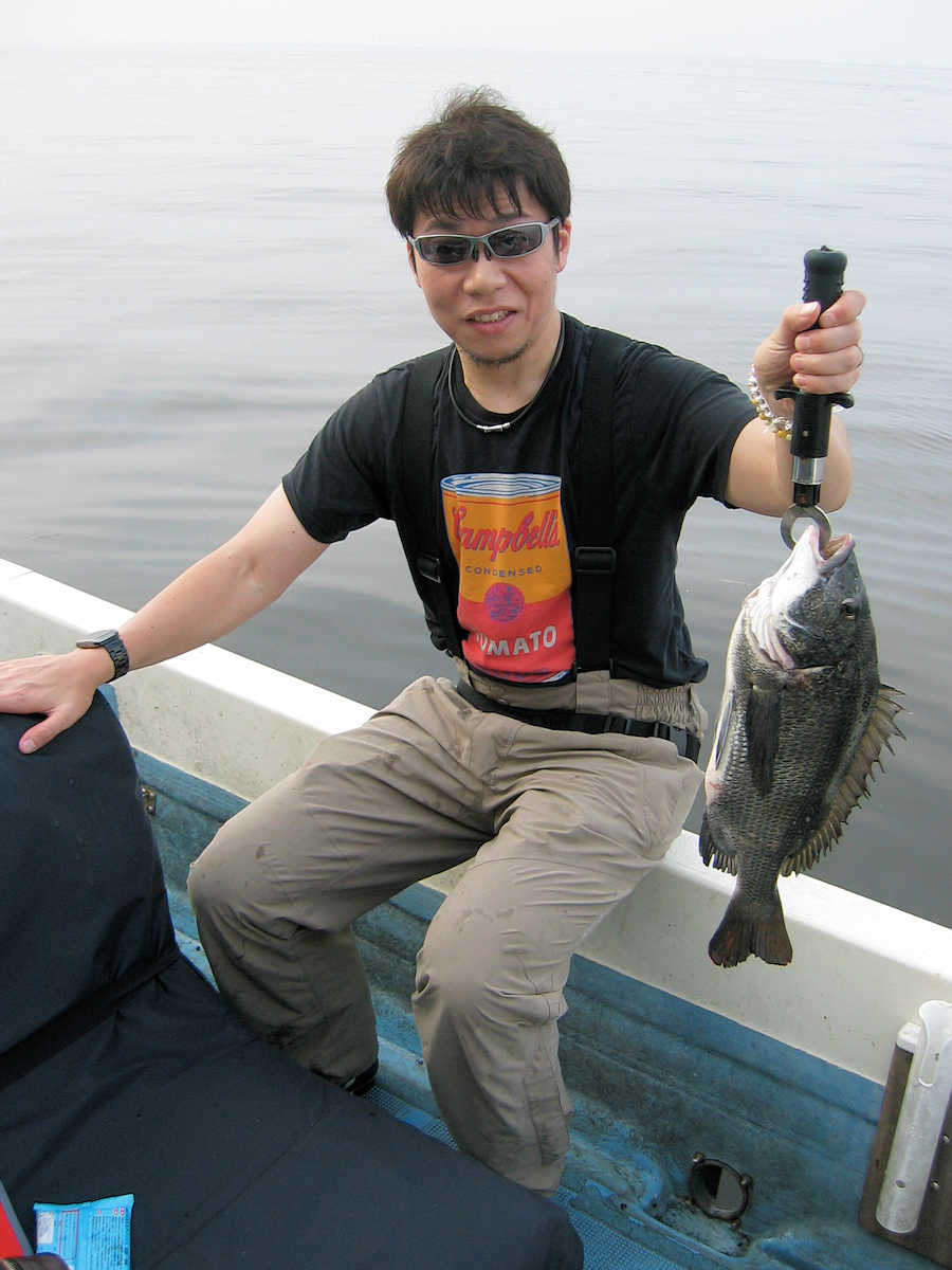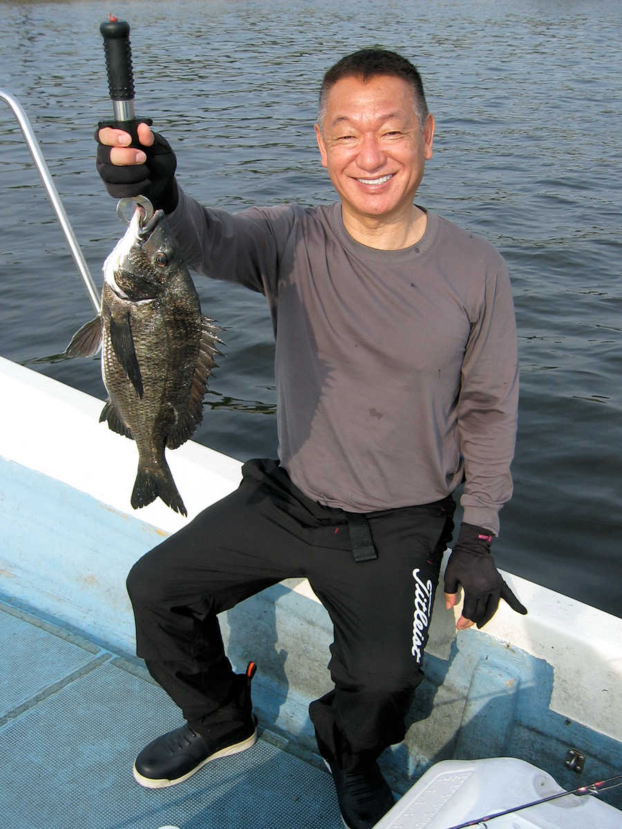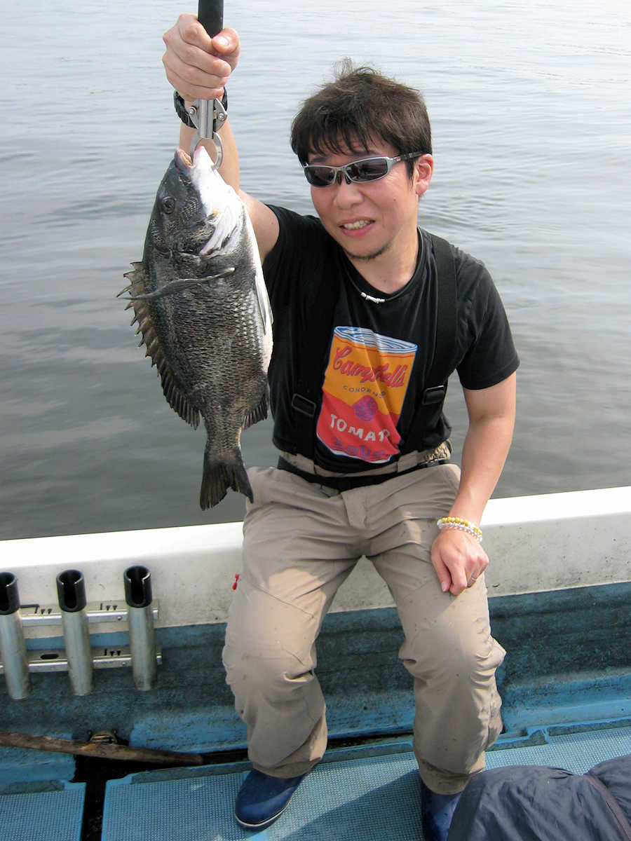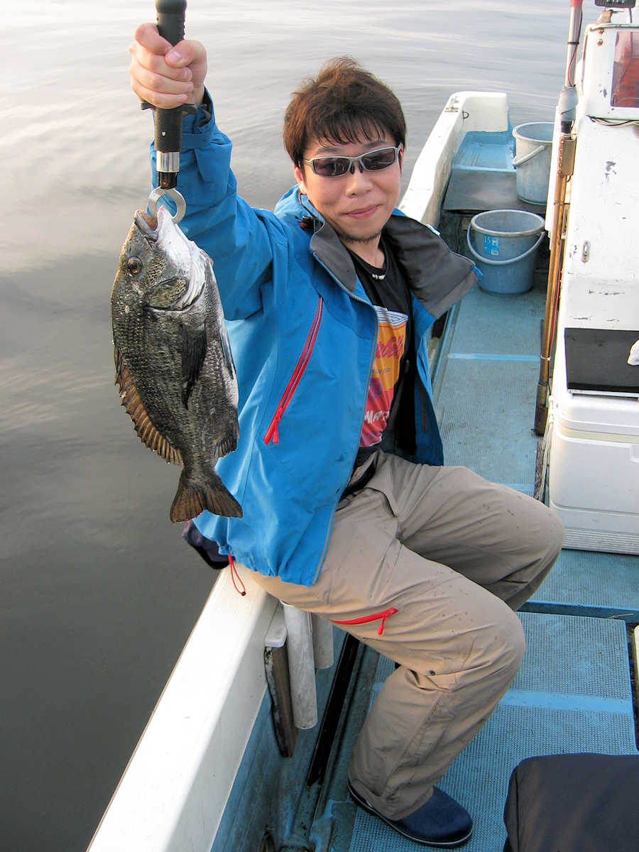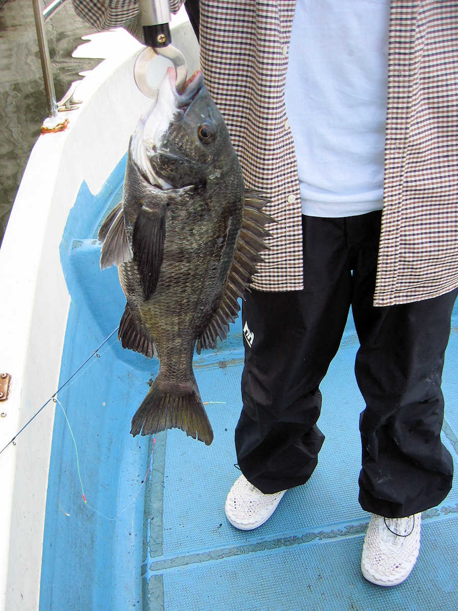 この日は当船の釣りに慣れたタイシさんが、初挑戦のお二人に先頭での竿出しを譲る『接待釣法』のお陰で、タニちゃんが11匹、さえちゃんが10匹の黒鯛をキャッチできました。