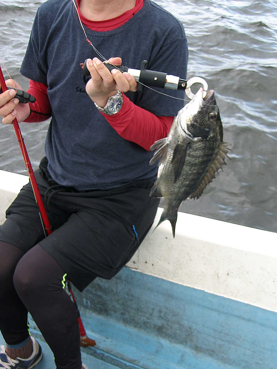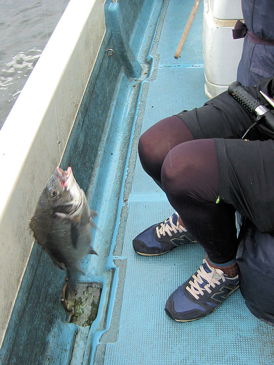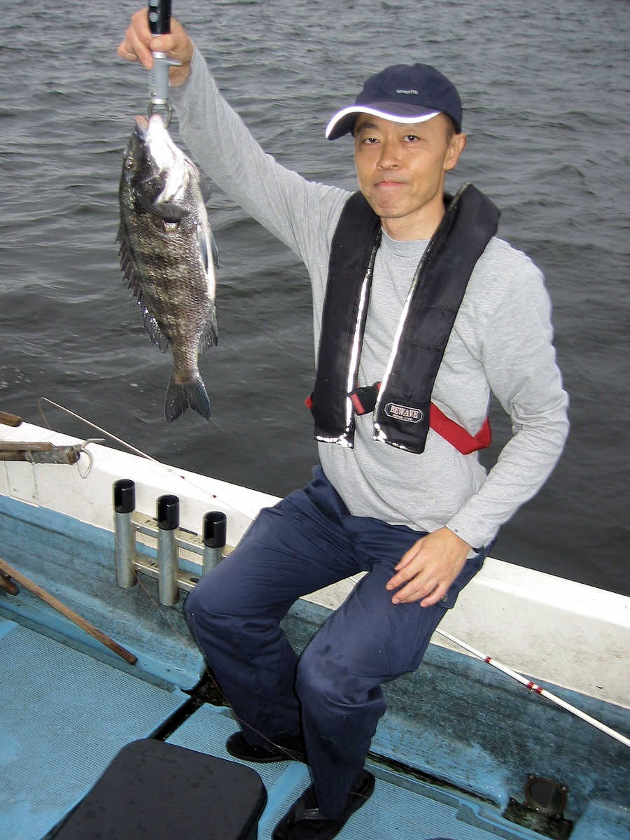 それでもアタリの多いポイントでは先頭入れ替えが激しく、仕掛けを1~5回入れるとアタリがあるので、「アッ!」との声と共に悔しそうな顔で、エサの付いていない針をブラブラさせながら、エサ付けのために後ろへ戻ってくる。