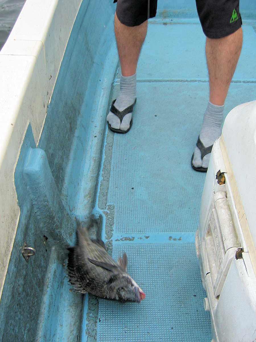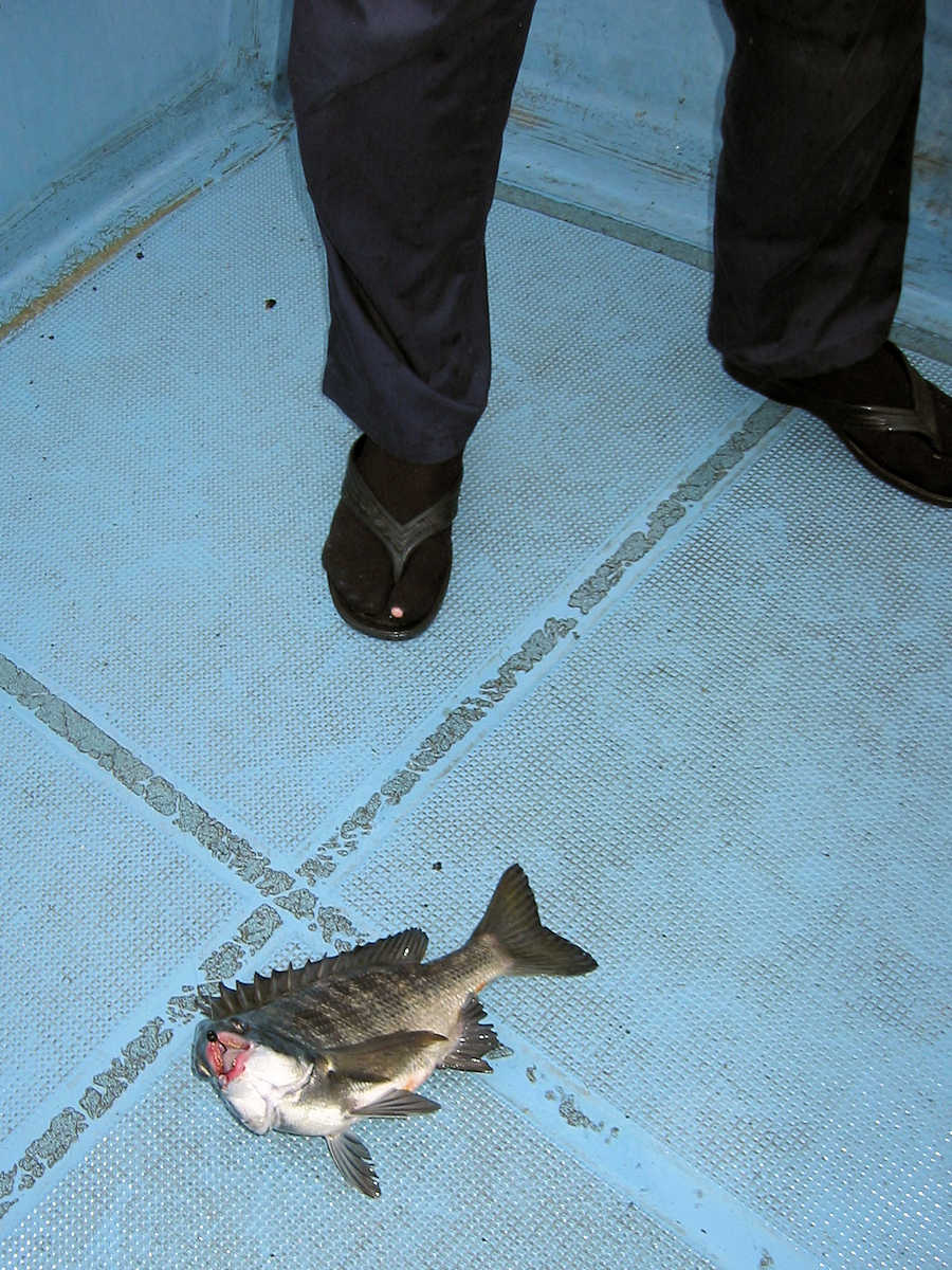 ちなみに、先頭の入れ替えは公平に行いましたので、写真を見てもらうと、誰が黒鯛をバラシ、先頭を交代したかがわかると思います。(釣り開始の先頭:じいさん→店長さん→わたちゃん)