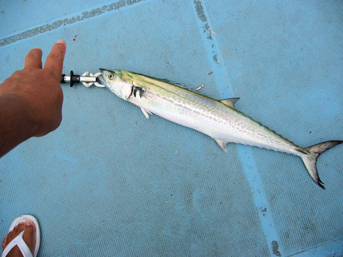 ■サワラ×3匹 ■タチウオ×20匹ぐらい ■コメント 出船したい時に限り悪天候が続き、この日、やっと出船できました。 連日太陽ギラギラの猛暑日が嘘のように、この日は厚い雲に覆われ、久しぶりに涼しい陽気。 サワちゃんのご機嫌が良い事を祈り走るも、ジャンプの姿を見たのは1匹だけ。 先週釣れた付近のベイト反応を狙い、タチウオ交じりでポツポツとアタリが続き、無事にサワちゃんを3匹キャッチできました。 後半はシーバスを狙う予定でしたが、北東の風が強く吹き出し断念! 結果、シーバスポイントは1箇所だけしか狙う事ができずノーバイトのまま終了となりました。 まあ、シーバス・サワラ共に本格シーズンはこれからなので、今年こそ楽しい釣りができる事を祈りましょう。 ■サワラ×3匹 □サイズ:75cm以上 ■タチウオ×20匹ぐらい □サイズ:特大×3匹/大×2匹/中×2匹/小×13匹ぐらい |