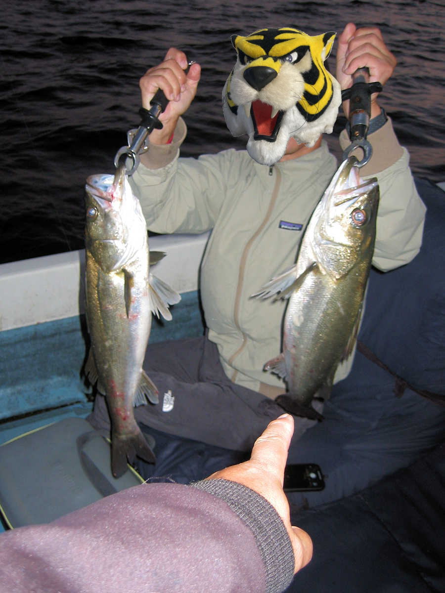 ■シーバス・デイ×12匹 ■サワラ×2匹(70cm級と90cm級) ■コメント 出船予定のお客さまが寝坊し出船中止となり、ルアーをブン投げたくてウズウズしている船着き場の近くに住んでいるお客さまに電話して叩き起こすと、「15分で行きます!」&「20分で行きます♪」となり狙いに行ってきました。 前日好調でしたので、心ウキウキで「今日も沢山釣るぞ~!」と全員気合が入っていました。 しかし結果は、「あちゃ~、数釣れず、大きさも小さめ!」となりました。 当日の反省としては、「船頭の狙い目と野生の勘が悪くシーバスの数が釣れず!」って感じでした。 トホホホホ・・・ まあ、この日の幸運としては、シーバスではなくサワラを2匹キャッチした事! 昔はこの時期当たり前のようにシーバスと青物が混じっていましたが、近年は青物どころかシーバスも釣れなくなってしまった。 今年はサワラだけ混じって欲しいな~。 ■シーバス・デイ×12匹 □サイズ:53cm前後×4匹/56cm前後×5匹/60cm前後×2匹/65cm×1匹 |