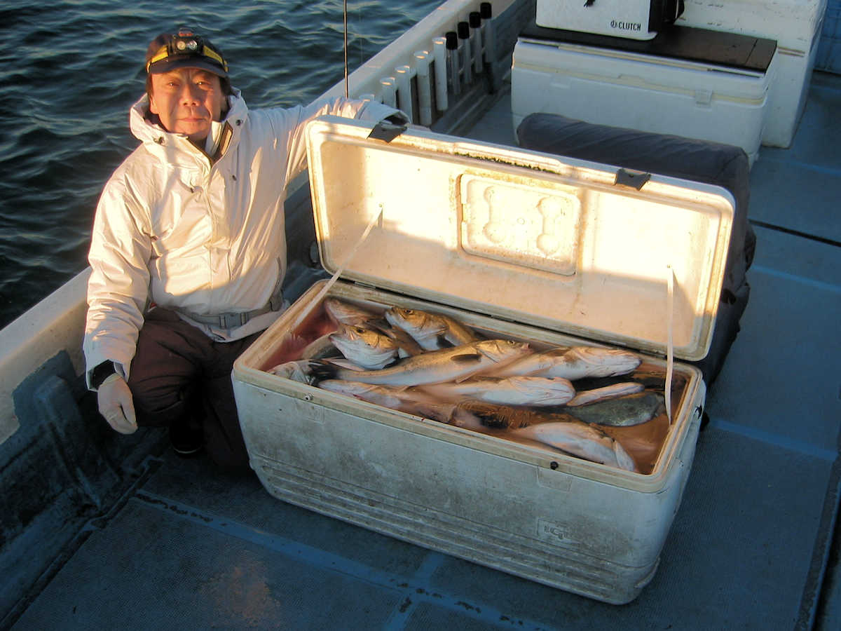 ■シーバス・ナイト×33匹 ■シーバス・デイ×魚を発見できず! ノーバイト\(-o-)/ ■サワラ×怪しいポイントを発見できず走り回っただけ。 ■コメント この日は、前日好調のナイトメインで出船しました。 幸運な事に前日と同じポイントに魚が入っており、クーラー満タンの楽しい釣りができました。 また、釣れるメインサイズが前日より少し大きくなり、63㎝前後のデブちゃんばかり。 写真を撮影する暇がないくらい忙しい釣りとなり、バラシも8匹以下と少なくお見事でした! デイはシーバスとサワラを探し、鳥ちゃんが騒いでいるポイントを探して走りましたが、怪しいポイントを発見できず、ちょろりシーバスを狙い終了となりました。 いや~、この日も釣れて良かったです♪ ■シーバス・ナイト×33匹 □サイズ:53cm前後×1匹/55cm前後×2匹/58cm前後×3匹ぐらい/63cm前後×21匹ぐらい/66cm前後×4匹/70cm×1匹/74cm×1匹 |
